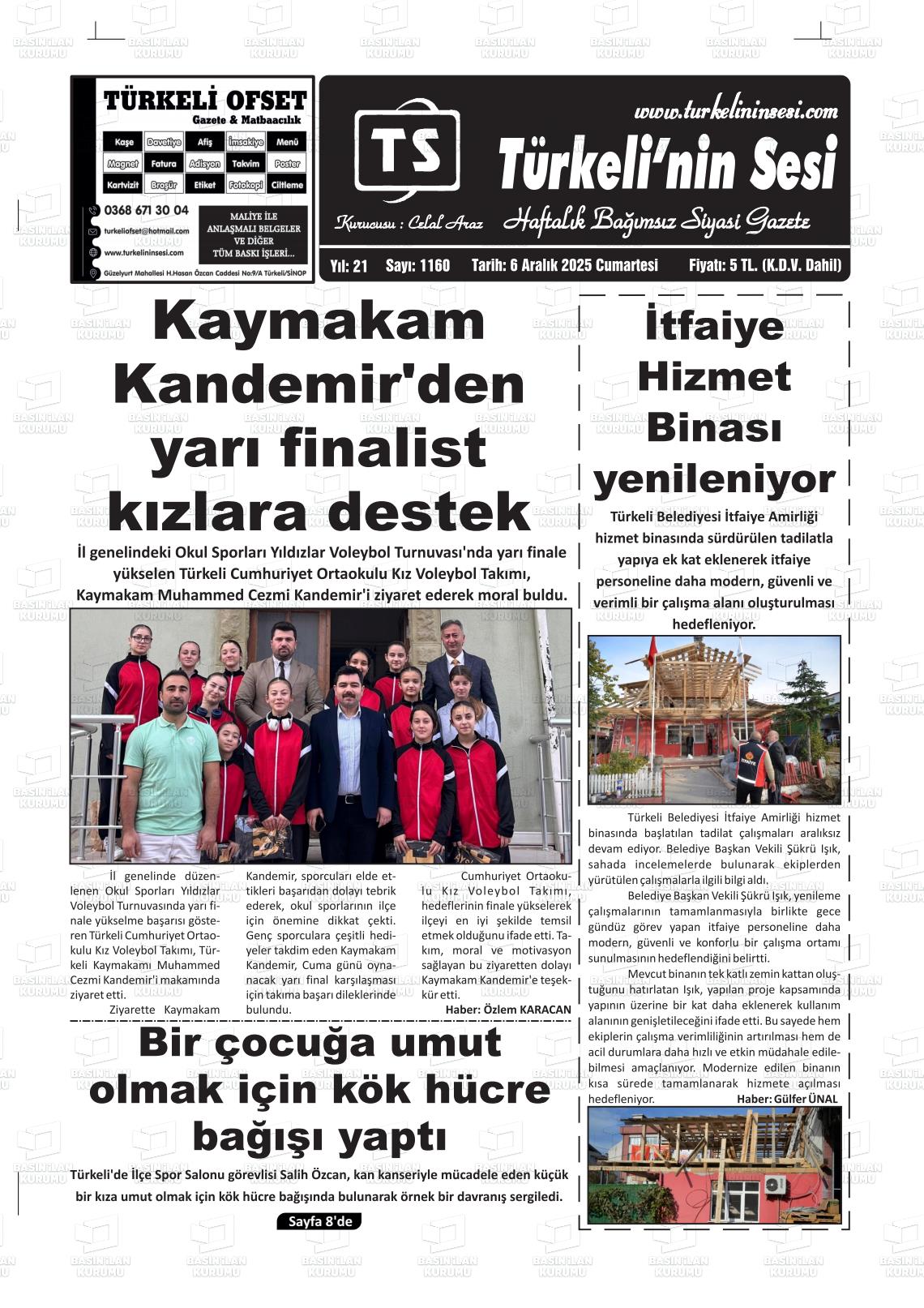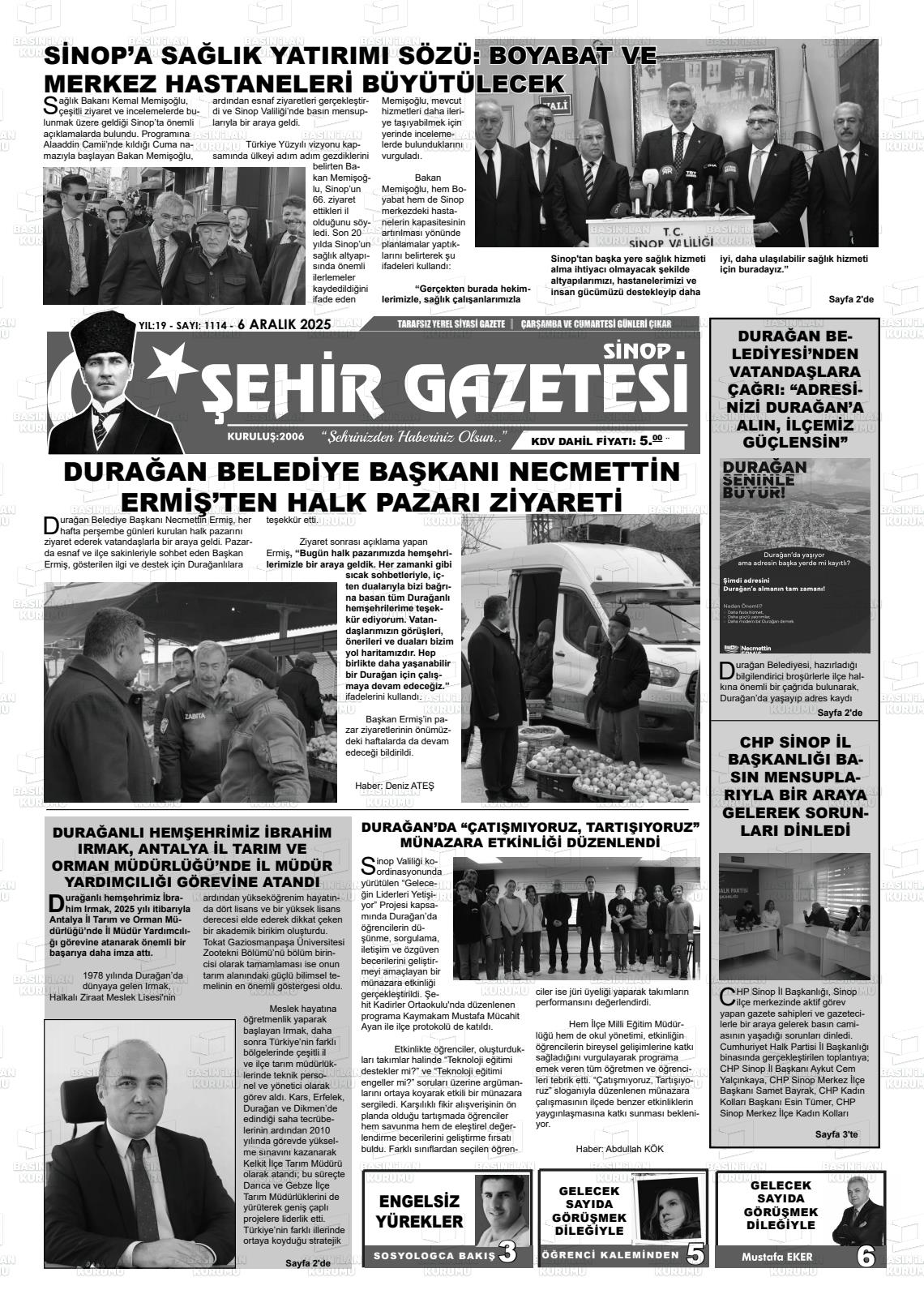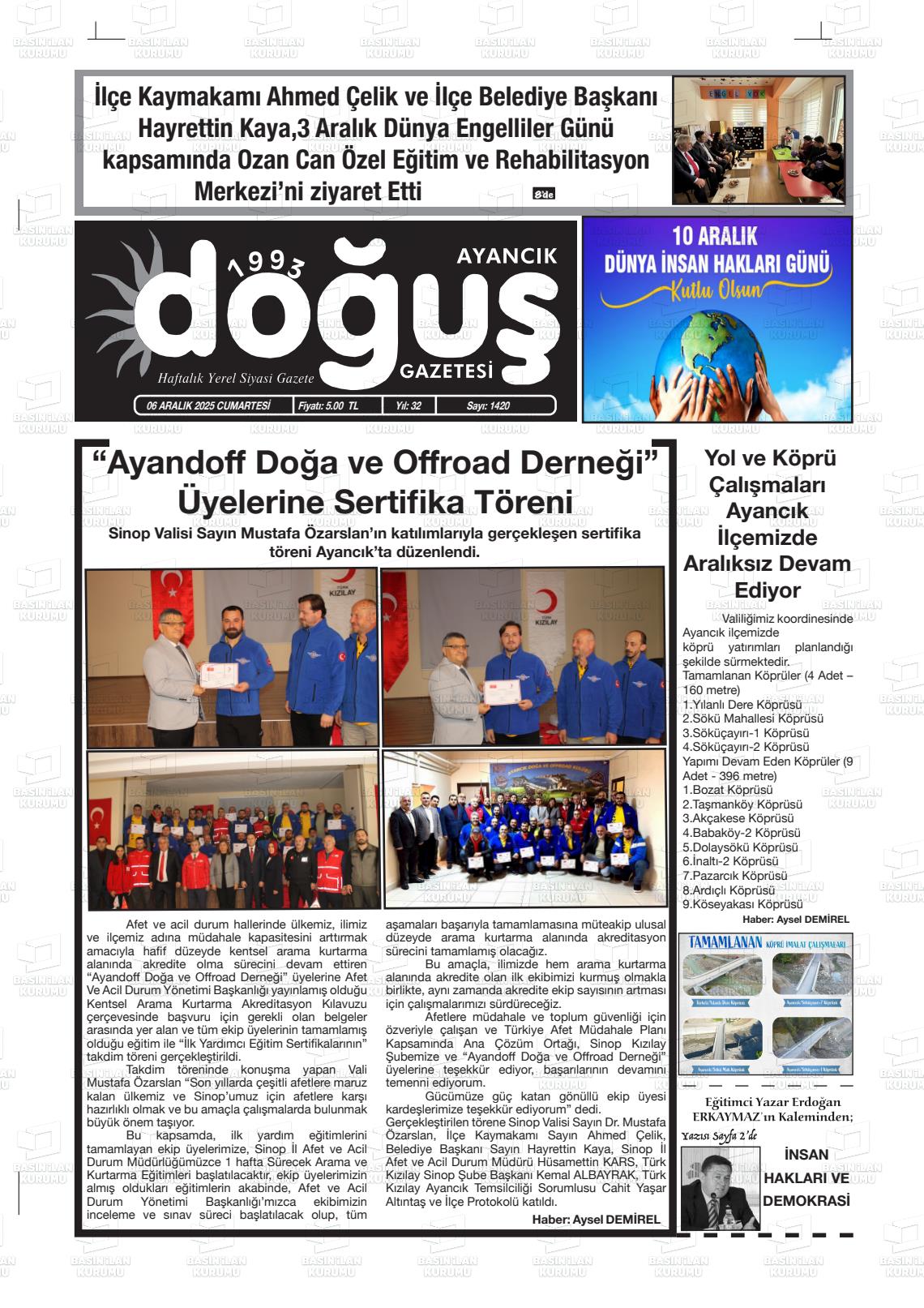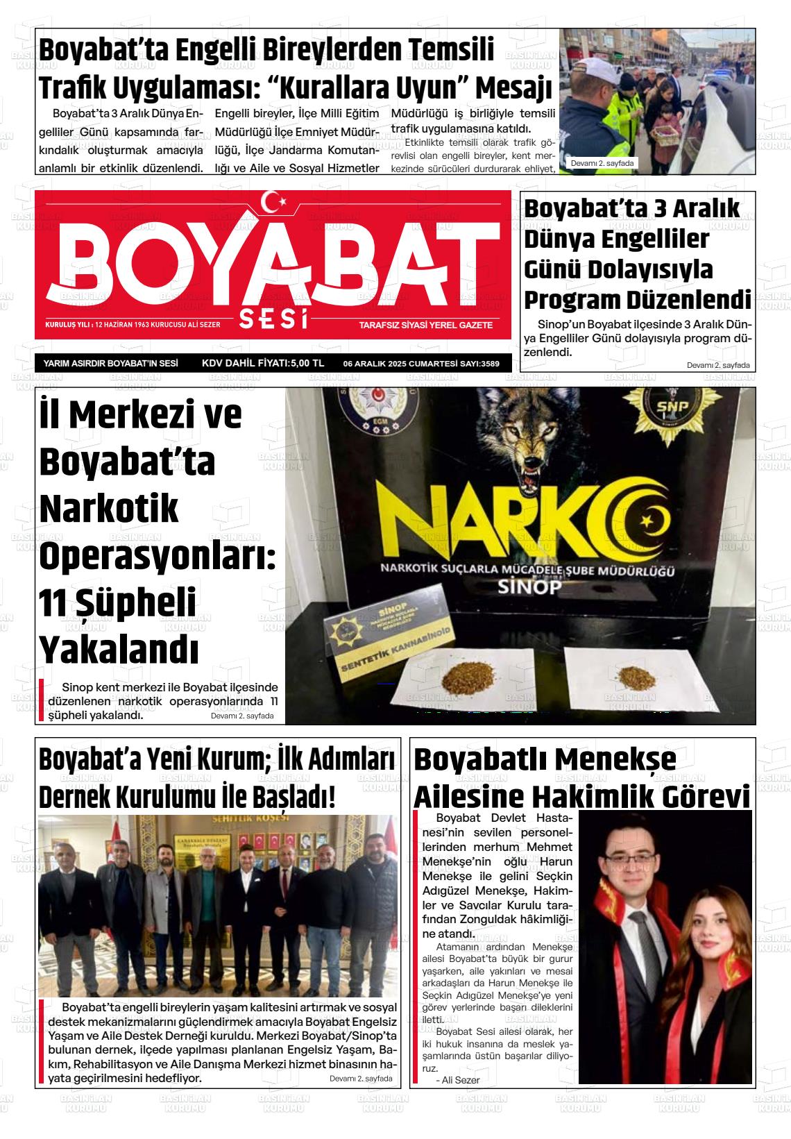 Sİnop Yerel Gazeteleri 06 Aralık 2025, Cumartesi Günü Manşeti